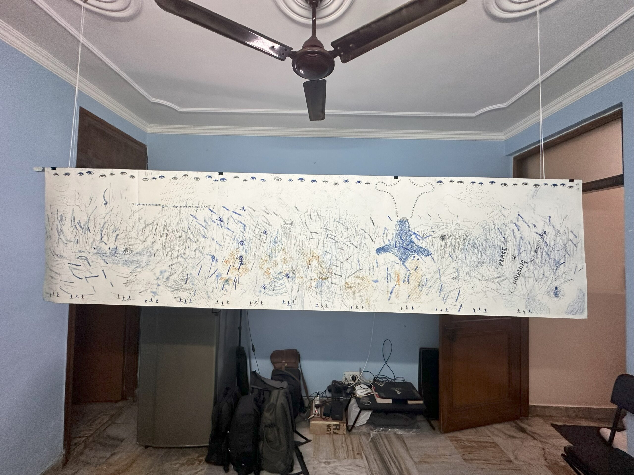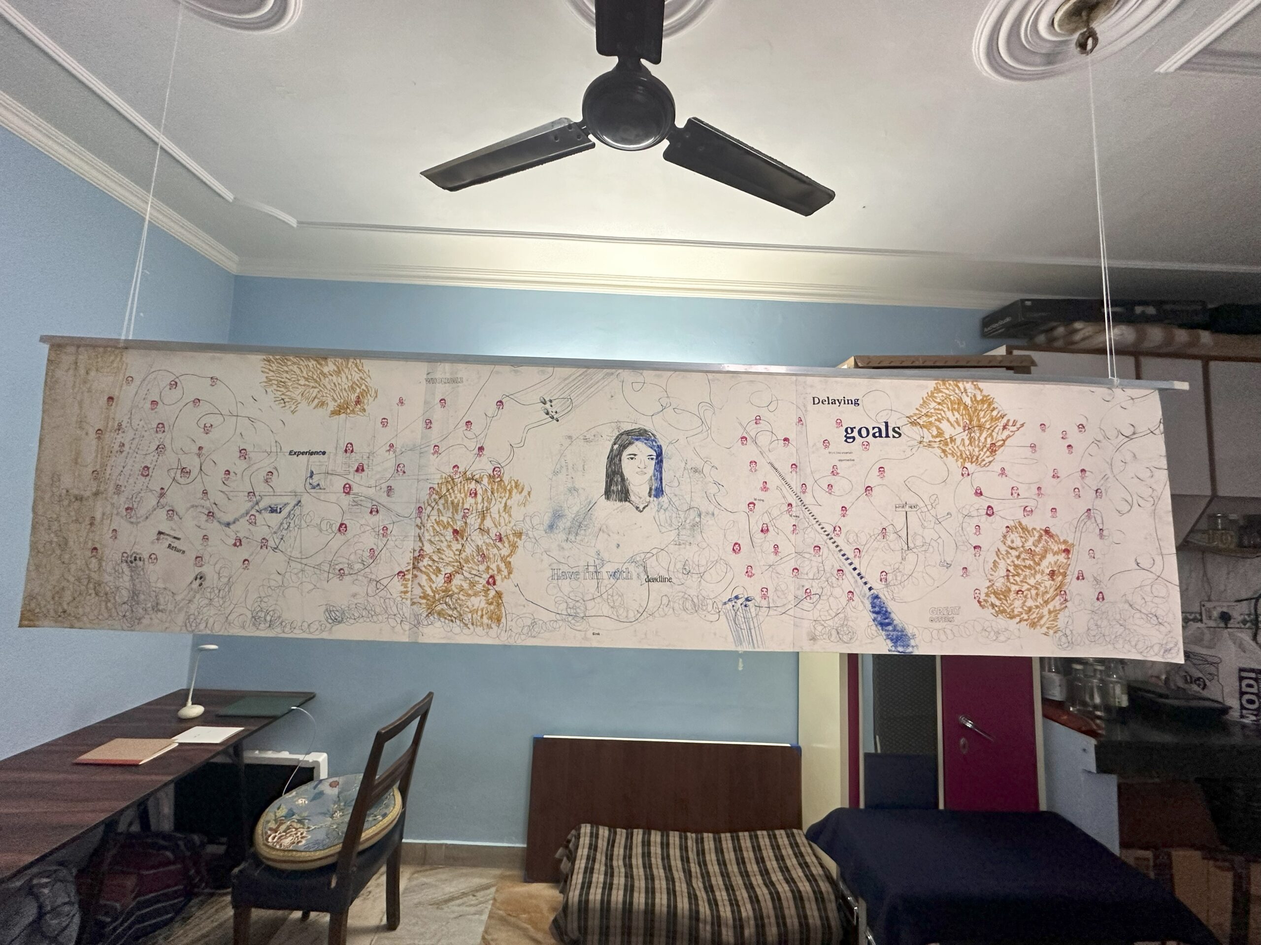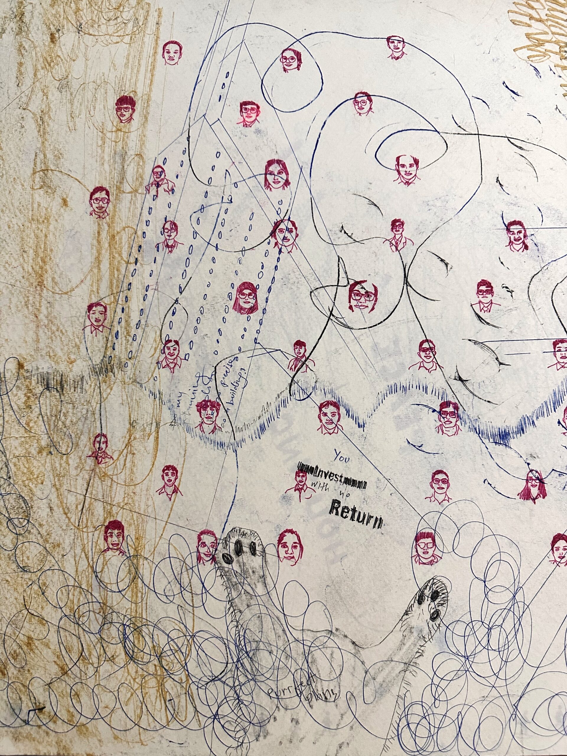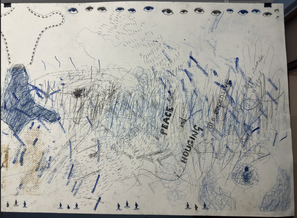This piece explores the interplay between the image on the paper and the one conjured in the viewer’s mind. In this artwork, I utilized double-sided drawings created with carbon paper. This technique allows for two distinct images to exist on the same page, one readily visible and the other hidden beneath. By experimenting with different colored carbon paper, the artwork introduces an element of surprise and dialogue. The interplay of colors adds another layer of meaning to the hidden image. The creative process reflects the artist’s own internal conversations and thought flow. The marks made on the paper become a form of journaling, a visual representation of the artist’s inner world.