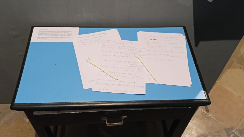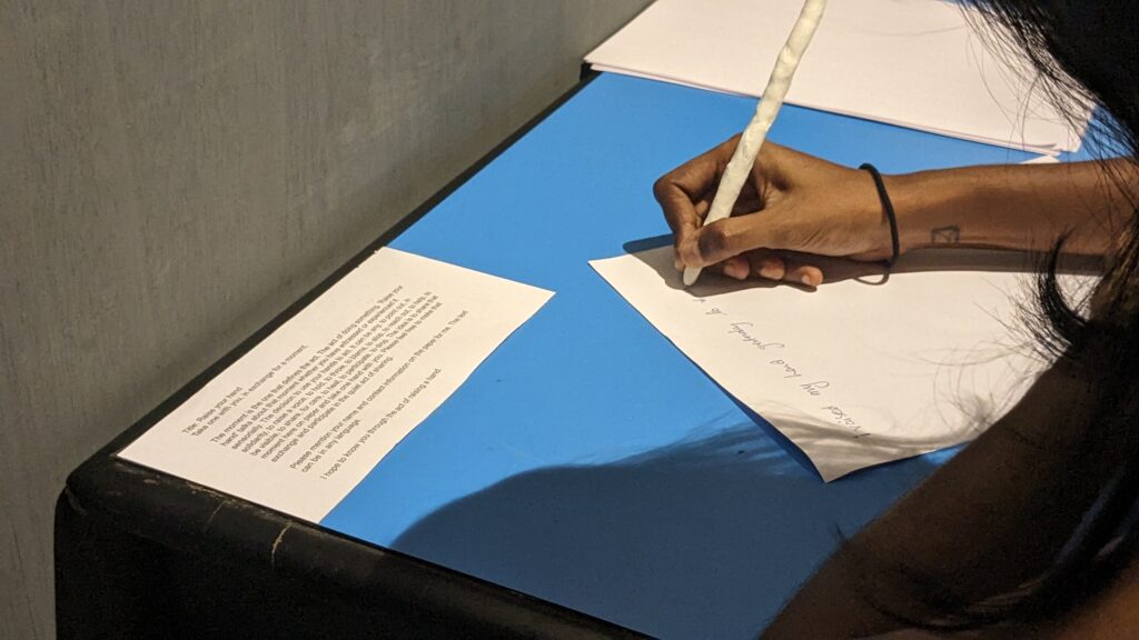 ‘Raise your hand’ talks about that moment whether you have witnessed or experienced it sensorially. The decision to use your hands to act. It can be any, to point out, in solidarity, to raise a voice, to hold, to throw, to blame, to stop, to reach out, to help, to be visible, to share, for care, to heal, to participate, to drop. The idea is to share that moment here on paper and take one hand with you. Please feel free to make that exchange and participate in the quiet act of sharing.