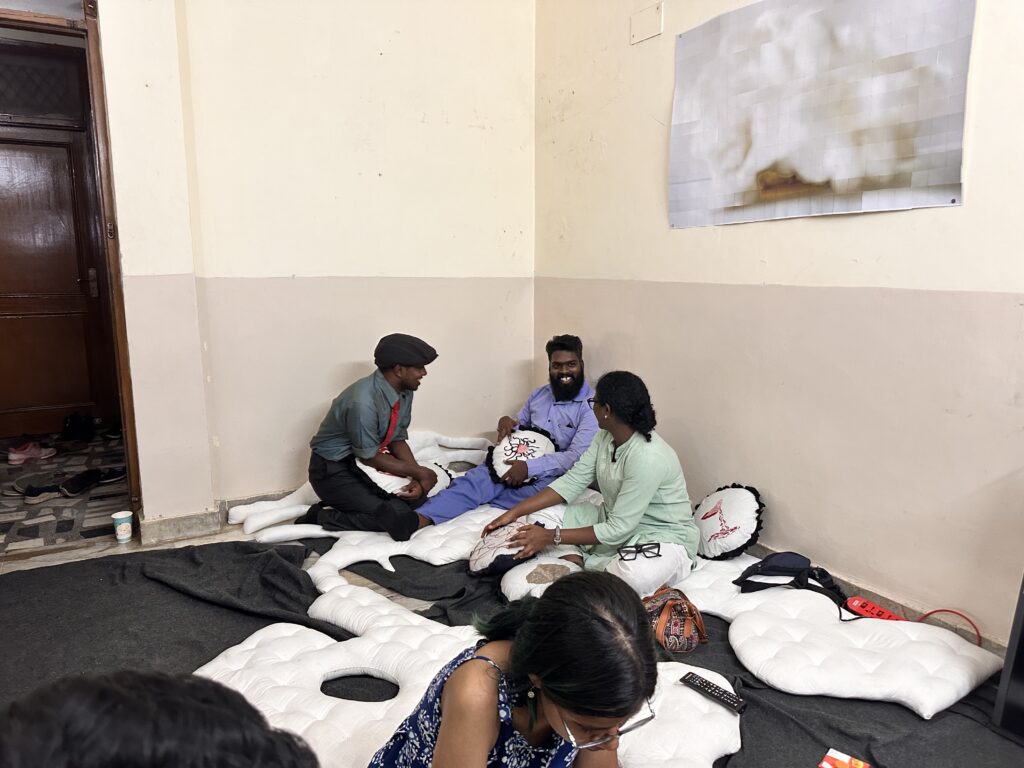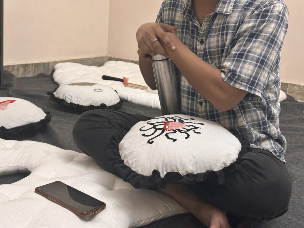 The recurring motifs on the pillows suggest the mental, sensory, and tactile aspects of this shared human experience. And while all of us acknowledge our exhaustion, the work also explores the comfort found in embracing it and perhaps discovering a sense of ease within that state.